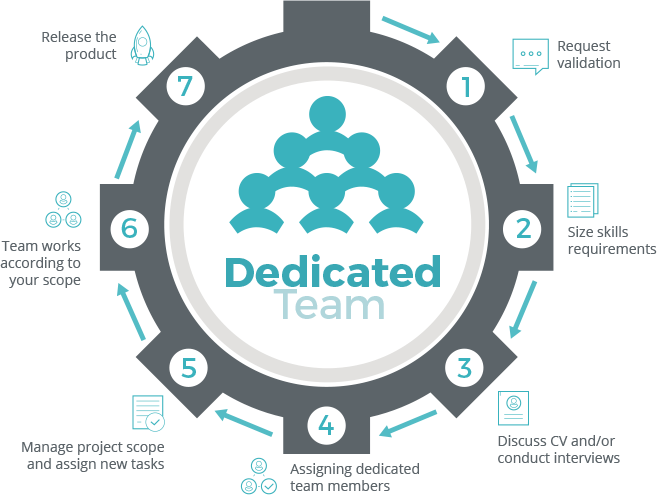 A dedicated team that Kutamo helps our clients put together will completely comply with the existing corporate culture, rules, and best practices of the client’s company. Moreover, this new team takes over the company’s technical resources, tools, and methodologies and should be expected to recognize themselves as an important part of the organization.